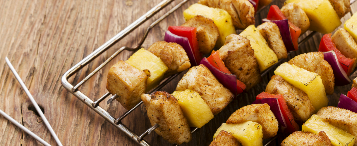 Nabij kurczaka, ananasa, paprykę i cebulę na szpadki i ułóż szaszłyki na blasze do pieczenia, a następnie wstaw je do rozgrzanego piekarnika i piecz przez 30-35 minut. Przed podaniem sprawdź, czy kurczak się dopiekł.
